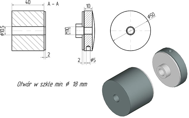 Uchwyt punktowy ø50/40mm fi 10,5mm, AISI 304, SZLIF
